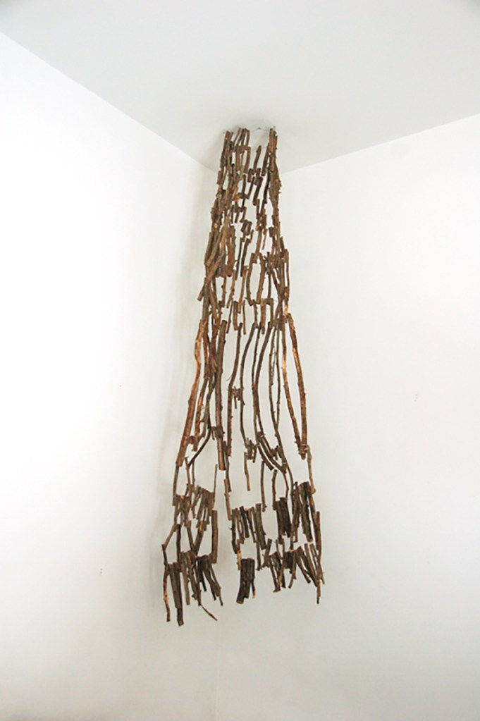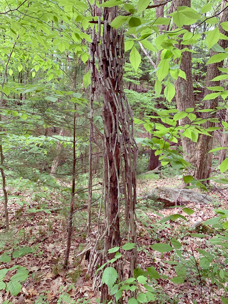 “Dress for a Tree” is made of cedar twigs and wire. It wraps around a tree in a way similar to how humans wear clothes.